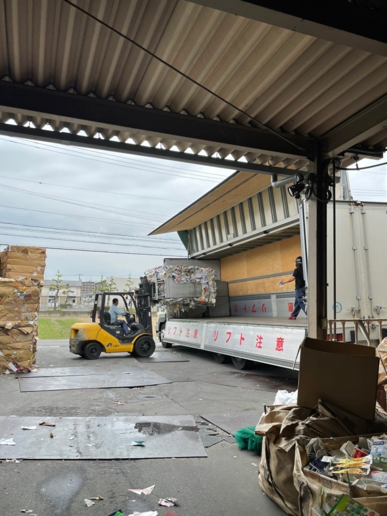 市民が利用した紙類は、小さく圧縮され県外の古紙再生業者に出荷されるそうです。たとえば、トイレットペーパーに加工するために愛媛県にトラックで運ばれていきます。