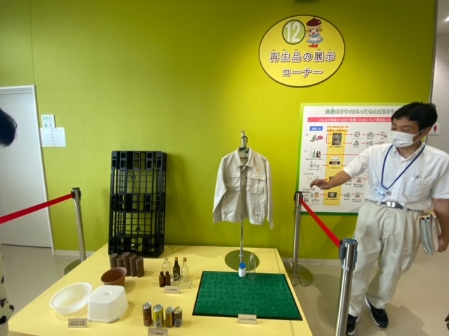 リサイクルセンターには環境学習コーナーが併設されており、再生品の展示コーナーでは、ペットボトル(65%)が繊維(服)になったり様々なものに生まれ変わっていることが分かります。