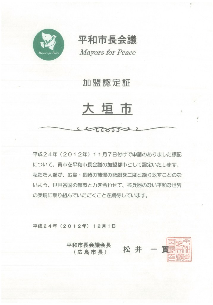特に「平和都市宣言自治体の行動について」は、質問後、大垣市のホームページに、これまであがってなかった「平和市長会議」加盟認定証を早速あげていただきました。(大垣市のホームページにPDFで掲載されています。)