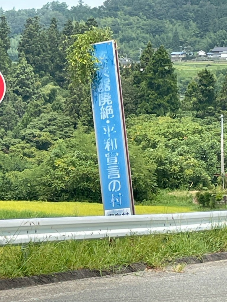 村の道には、年季の入った「核兵器廃絶・平和宣言の村」という大きな看板が。