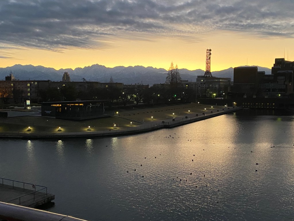 朝は、環水公園への散歩。立山連峰に朝日が差し込む様子がきれいでした。