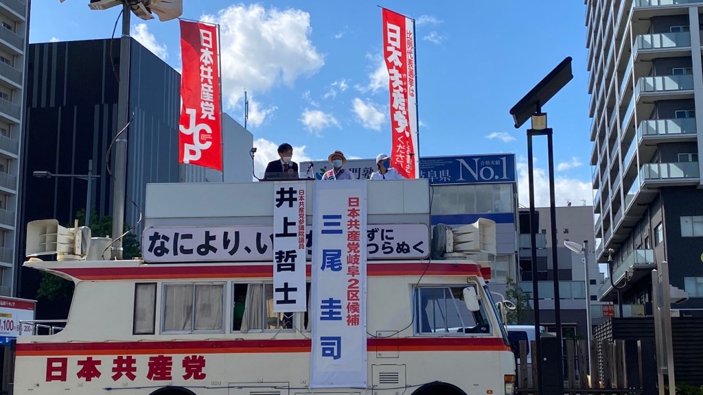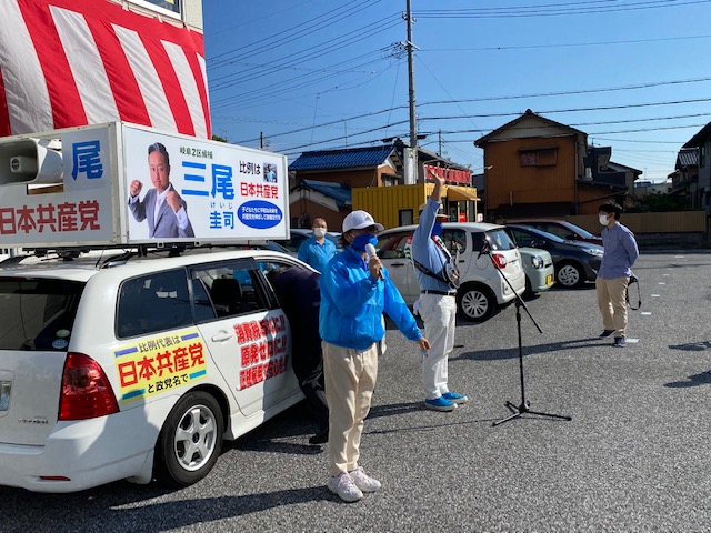 井上哲士参議院議員やもとむら伸子衆議院議員も応援に駆け付けてくれ、岐阜2区は、三尾圭司さん、比例は共産党と訴えています。